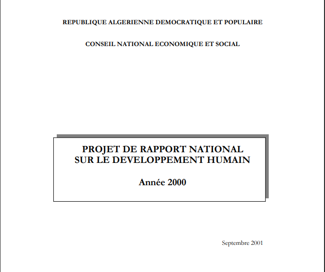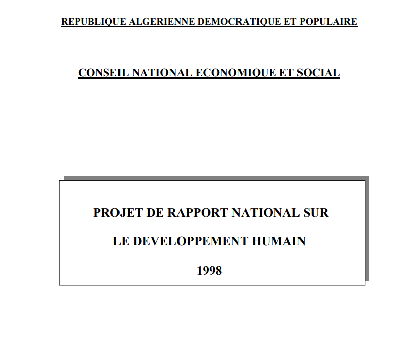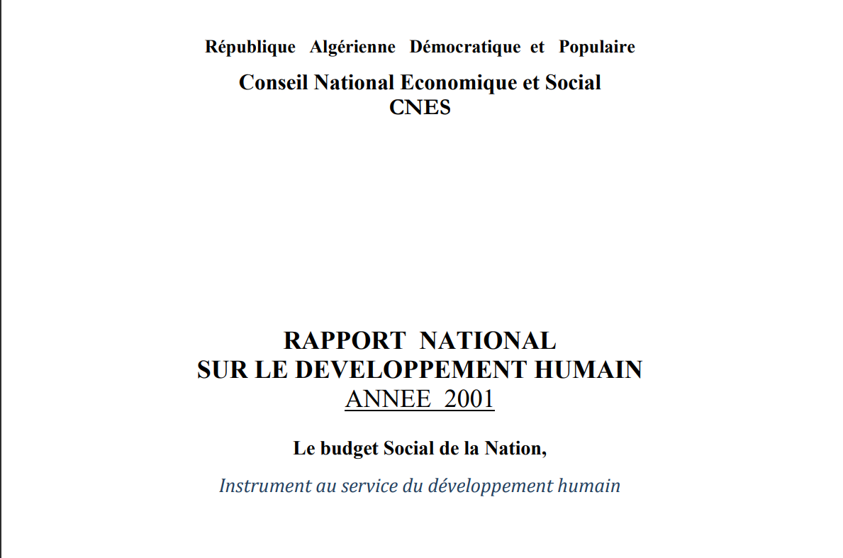Le Conseil National Economique et Social (CNES) a été chargé de l’élaboration du premier Rapport National sur le Développement Humain, tâche qu’il a menée avec la collaboration des principaux secteurs concernés ainsi qu’avec l’appui de la représentation du PNUD à Alger. L’objet d’un tel rapport, à travers l’évaluation des politiques publiques qu’il implique, est d’initier un débat sur les finalités et les résultats de ces politiques, ainsi que d’élargir le champ de la concertation sur les différents aspects du développement humain. En ce qu’il représente un espace de dialogue qui réunit les différents acteurs de la vie économique et sociale (associations, syndicats, patronat, administration), le CNES constitue un lieu privilégié pour la domiciliation d’une telle activité.