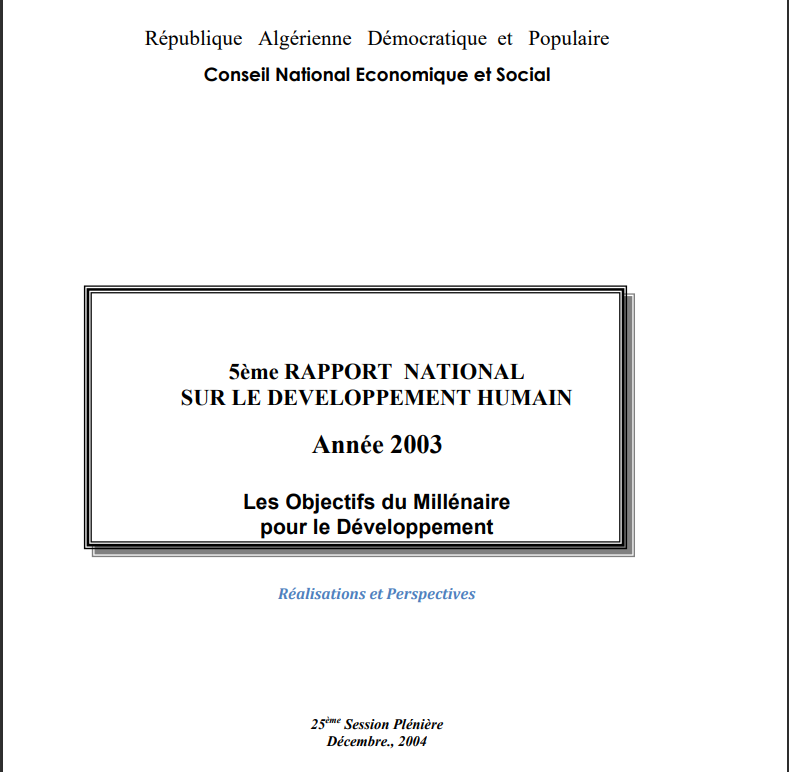 Le RNDH 2003 évalue le chemin parcouru et celui qui reste à faire dans la réalisation des objectifs de développement du millénaire. La finalité d’une telle approche, qui s’inscrit dans la logique des travaux du CNES, est de contribuer à l’amélioration qualitative du modèle social algérien de développement, fruit du combat pour l’indépendance et des luttes sociales. Aussi, les différentes étapes d’élaboration et d’approbation de ce rapport résultent d’interactions impliquant les composantes sociales de notre institution, dans leurs nombreuses sensibilités, ainsi que les différentes administrations concernées.